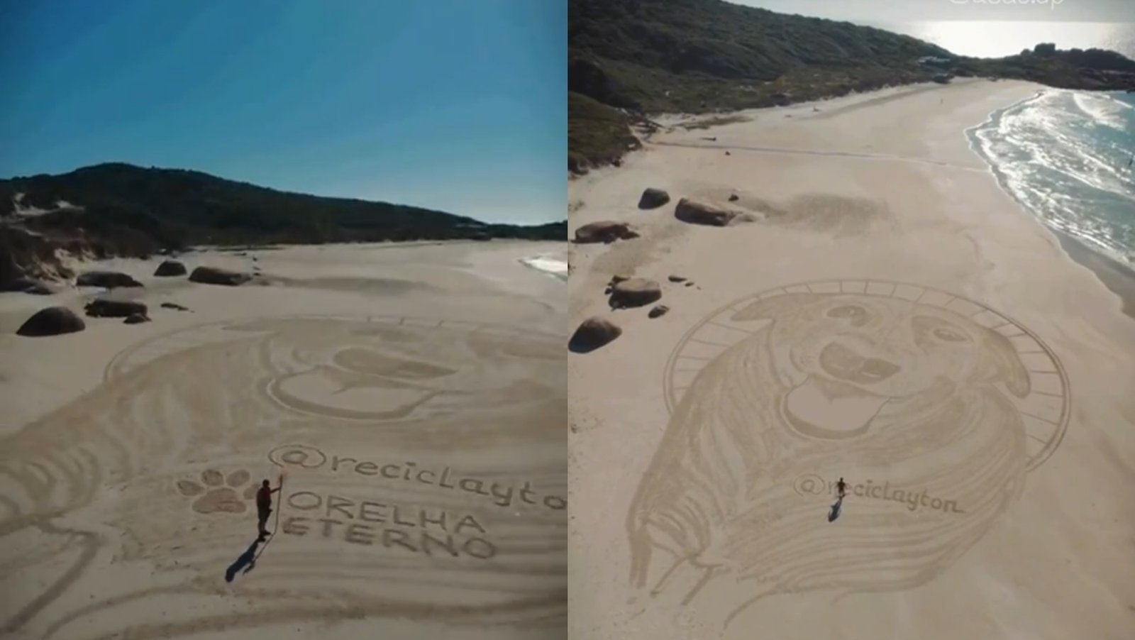 Uma homenagem ao cão comunitário Orelha foi feita na areia da Praia da Galheta, em Florianópolis, nesta semana, e chamou a atenção de moradores, turistas e usuários das redes sociais.