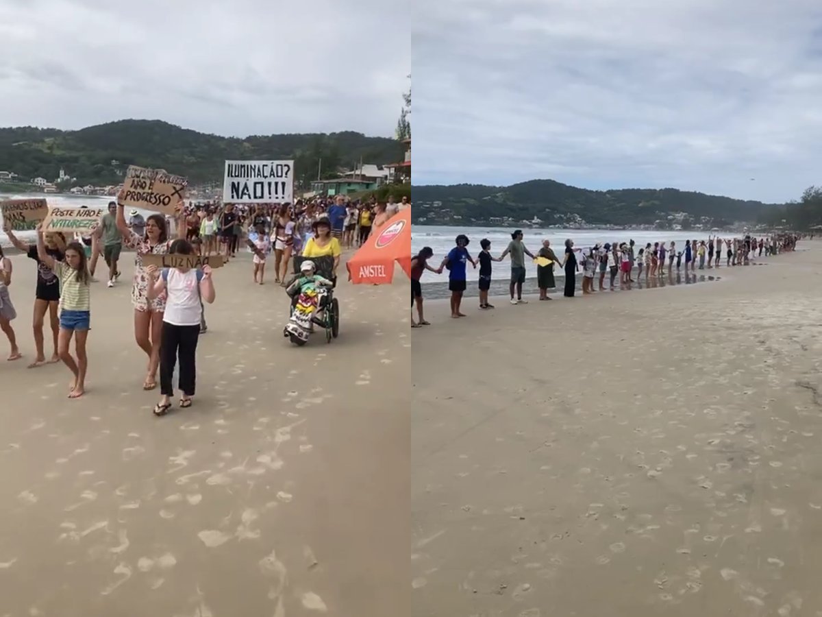 Moradores e frequentadores de Garopaba realizaram um ato público na manhã deste sábado (11) contra a instalação de 32 postes de iluminação LED na faixa de areia da Praia Central. O grupo se concentrou na Avenida dos Pescadores, caminhou pela orla e formou uma corrente humana na beira do mar, com cartazes como “Iluminação? Não!!!”, “Poste não é natureza” e “Luz não”.