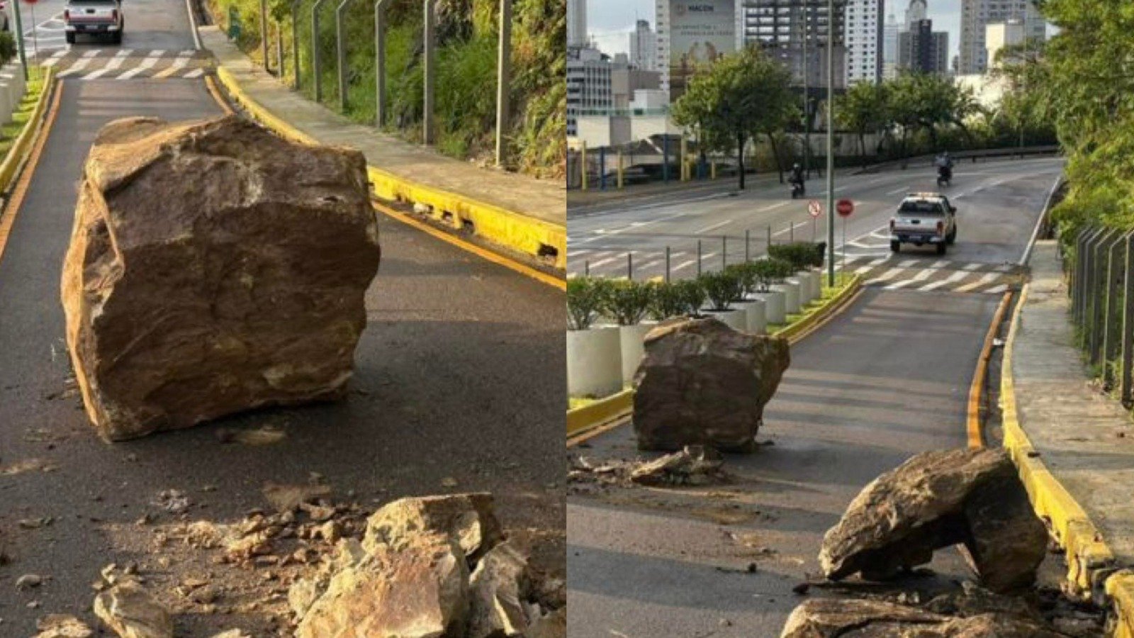 Um rolamento de rocha bloqueou o acesso ao Cristo Luz, um dos principais cartões-postais de Balneário Camboriú, na manhã desta terça-feira (7). A pedra de grandes proporções se desprendeu da encosta e atingiu a rua Indonésia, via que liga a cidade ao monumento turístico. A pista no sentido de descida permanece totalmente interditada.