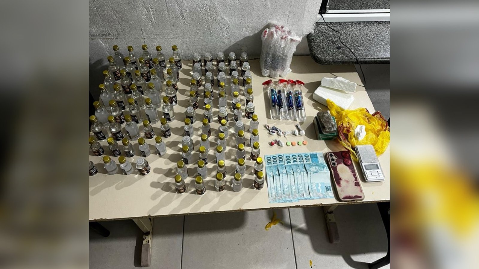 No total, foram apreendidos 106 frascos de substância semelhante a lança-perfume, cerca de 500 gramas de cocaína, porções adicionais de cocaína, maconha, comprimidos de ecstasy e uma balança de precisão. Próximo à motocicleta utilizada na fuga também foram localizadas porções de droga. Com o morador, os policiais encontraram R$ 700 em dinheiro.