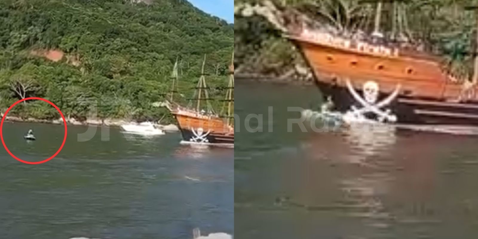 Ainda segundo testemunhas, a tripulação do barco pirata não percebeu imediatamente que havia atingido o jetski. Os ocupantes da moto aquática reapareceram metros à frente do ponto da colisão e foram resgatados em seguida.