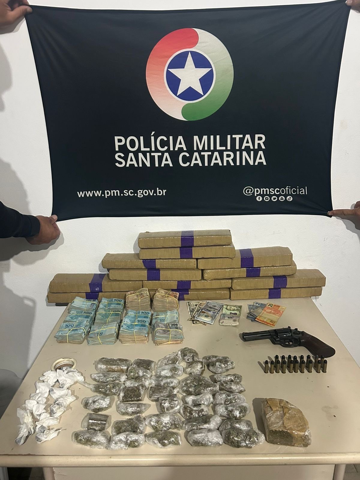No local, os policiais encontraram 10 kg de maconha, um revólver calibre .38 com 18 munições, R$ 124.026,00 em espécie, US$ 175 em dólares, três aparelhos celulares, uma balança e materiais para embalo de drogas.