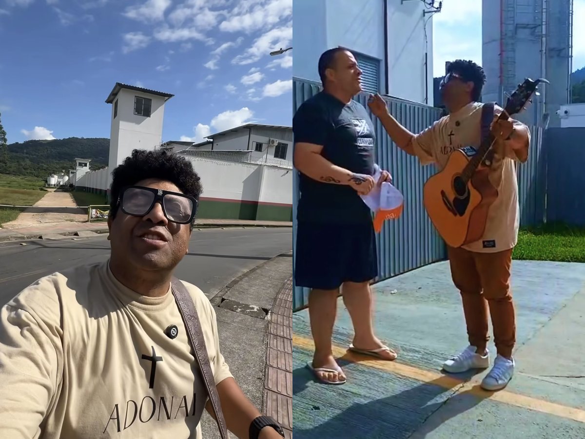 Nas imagens, é possível ver Edy tocando violão e cantando ao lado do homem, que acabara de deixar o presídio. A cena foi registrada na área externa da unidade, com a torre de vigilância ao fundo.