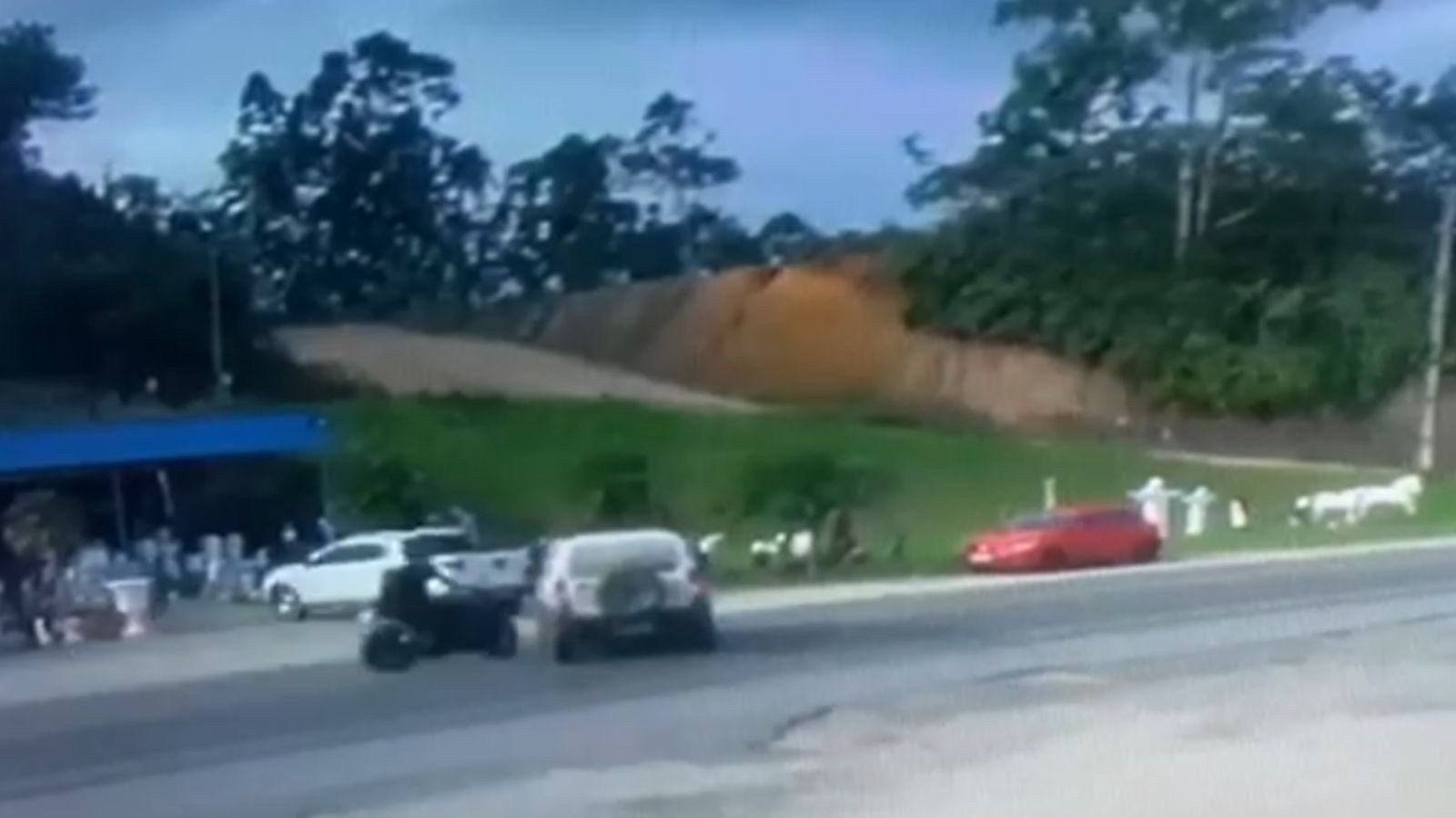 Imagens de câmeras de segurança registraram uma colisão entre uma motocicleta e um automóvel na rodovia SC-410, em Canelinha, na tarde de sexta-feira (20). O acidente aconteceu por volta das 16h40 e deixou um motociclista de 23 anos ferido.