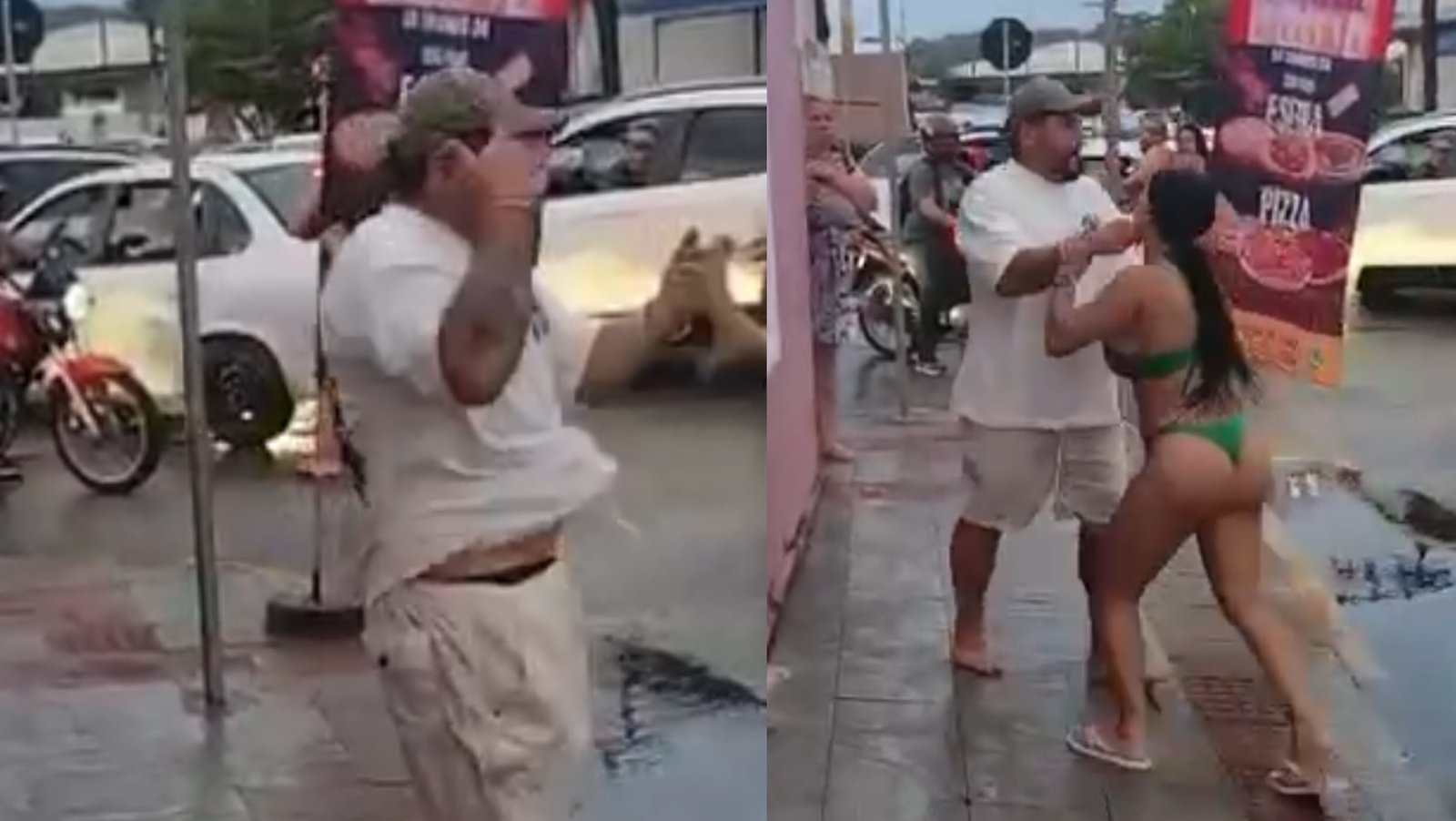 O vídeo também mostra empurrões, gritos e uma discussão generalizada em plena calçada, com pessoas tentando intervir. Em determinado momento, o homem faz gestos como se estivesse sacando armas de fogo da cintura, o que aumentou ainda mais a tensão entre os envolvidos.