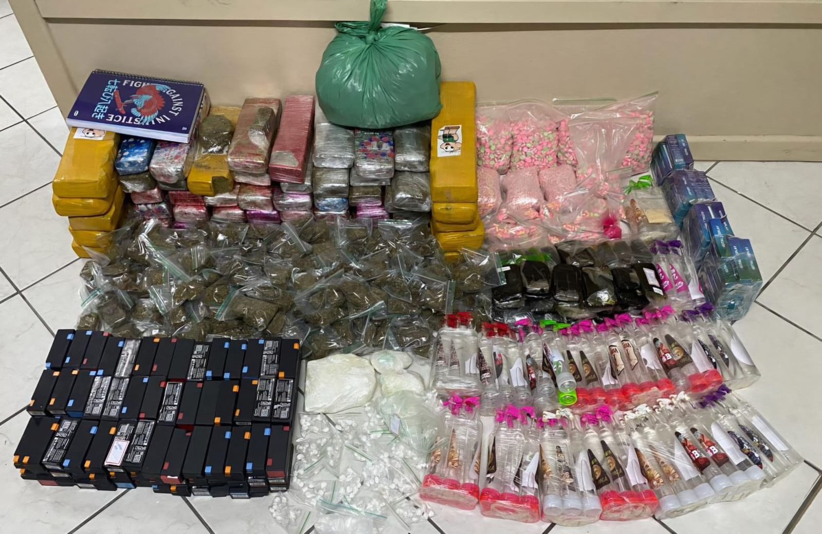 Durante a abordagem e as buscas, os policiais localizaram grande quantidade de entorpecentes e materiais relacionados à comercialização ilegal. Foram apreendidos 8.400 comprimidos de ecstasy, 24 gramas de MDMA, 3,792 quilos de haxixe, 96 frascos de lança-perfume, 49 quilos de maconha, 974 gramas de cocaína, 125 unidades de óleo de THC, 59 canetas utilizadas para consumo do óleo, sete balanças de precisão, dez aparelhos celulares, R$ 102 em dinheiro, uma bolsa usada para transporte e entrega, material para embalo de drogas e um caderno com anotações referentes ao comércio ilegal.