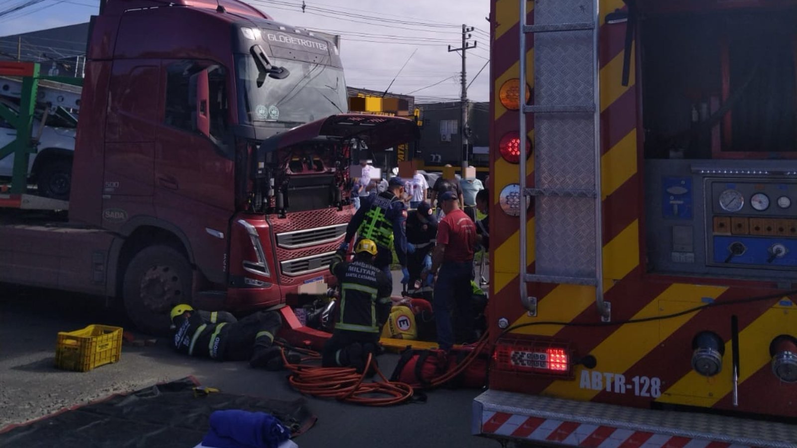 Para a retirada da segunda vítima, que conduzia a motocicleta, foi necessário elevar o eixo dianteiro do caminhão com o uso de cilindro expansor hidráulico. Com o alívio do peso sobre a motocicleta, o membro inferior foi liberado e a vítima foi imobilizada em maca para encaminhamento ao hospital.