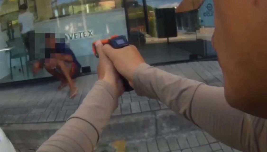 Na sequência, ele fugiu a pé, pegou pedras e voltou a ameaçar os policiais, além de tentar entrar em comércios próximos. Durante o acompanhamento, as pedras foram arremessadas ao solo, mas o homem seguiu em atitude agressiva. Diante do risco e da resistência, foi dada voz de prisão.