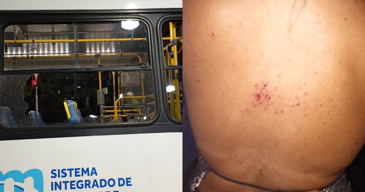 Já do lado de fora, o suspeito voltou a ameaçar, desta vez dizendo que jogaria a garrafa contra o motorista. Em seguida, ele arremessou o objeto contra a lateral do ônibus, quebrando um dos vidros. Com o impacto, estilhaços atingiram dois passageiros que estavam no interior do veículo.