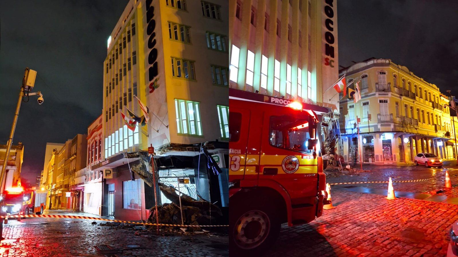 Parte da marquise de um edifício desabou na noite de domingo (18) na Rua Trajano, no Centro de Florianópolis. A ocorrência foi registrada por volta das 21h56 e mobilizou equipes do Corpo de Bombeiros Militar de Santa Catarina, acionadas pela Central de Emergências (193).
