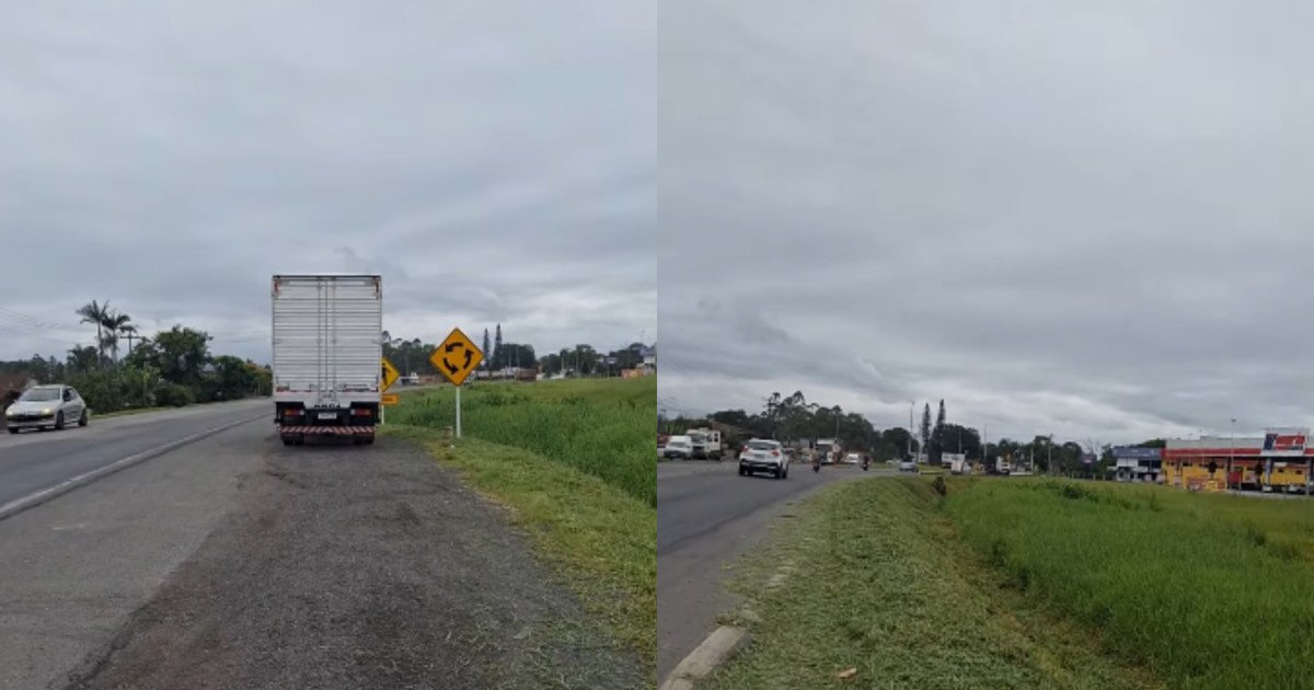 Uma moradora de Araquari (SC) gravou um vídeo para questionar o estacionamento de caminhões às margens da via e alertar para o risco enfrentado por pedestres. A gravação foi feita em um trecho próximo a um mercado da cidade.
