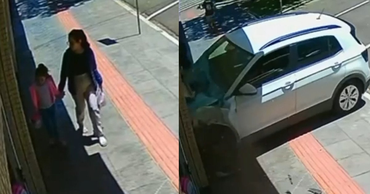As gravações revelam que, instantes antes da colisão, uma mulher com uma criança e um jovem passaram exatamente pelo trecho atingido pelo veículo. Cerca de dez segundos depois, o automóvel avançou desgovernado e atingiu a fachada da loja. Se o impacto tivesse ocorrido momentos antes, pessoas poderiam ter sido atingidas.