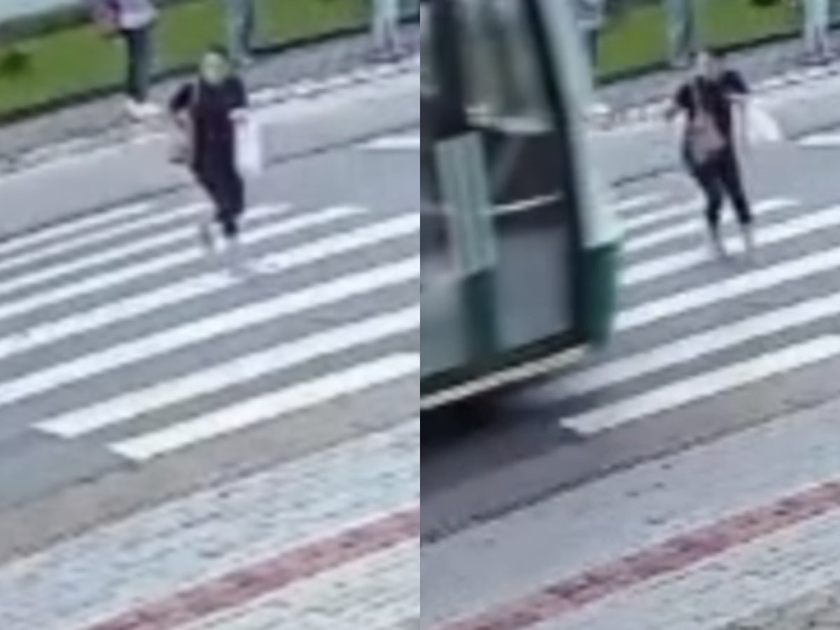 As imagens da câmera de segurança mostram o momento do atropelamento. Nas gravações, é possível ver um ônibus amarelo parado em um dos sentidos da via, aparentemente em fila. A mulher sai por trás do coletivo parado e atravessa a faixa em passo acelerado, olhando apenas para um lado.