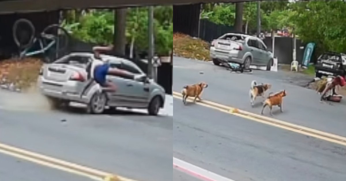 Logo em seguida, um detalhe inusitado ganha destaque. Três cães que estavam do outro lado da pista correm rapidamente até o ciclista e permanecem ao lado dele, como se estivessem protegendo o rapaz enquanto ele permanece caído ao solo. A atitude dos animais, espontânea e quase simultânea, virou o principal assunto do vídeo nas redes sociais.
