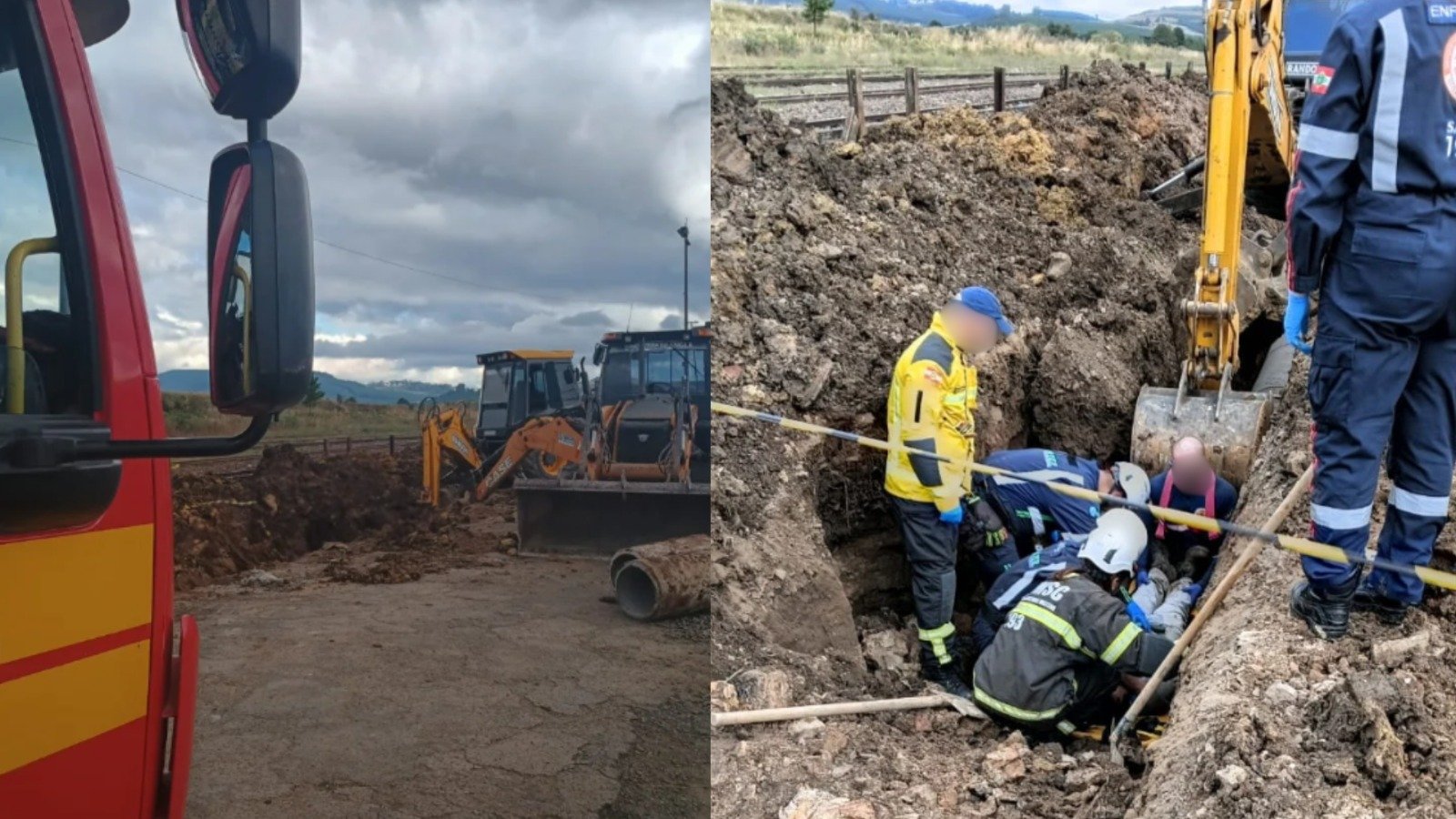 Ao chegarem ao local, os bombeiros encontraram o trabalhador consciente, porém com fortes dores na região da cintura e no tórax e com dificuldade respiratória causada pela pressão da terra sobre o corpo. A situação era agravada por um detalhe que tornava o resgate ainda mais complexo: as pernas da vítima estavam presas dentro de um tubo de concreto no fundo da vala.