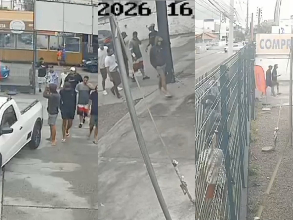 As gravações, obtidas de câmeras do entorno do estabelecimento, mostram o grupo agindo com organização. Os homens aparecem andando em grupo pela calçada e entrando na revenda. Um dos registros exibe o horário de 16h39, confirmando que a ação aconteceu ainda durante a tarde.