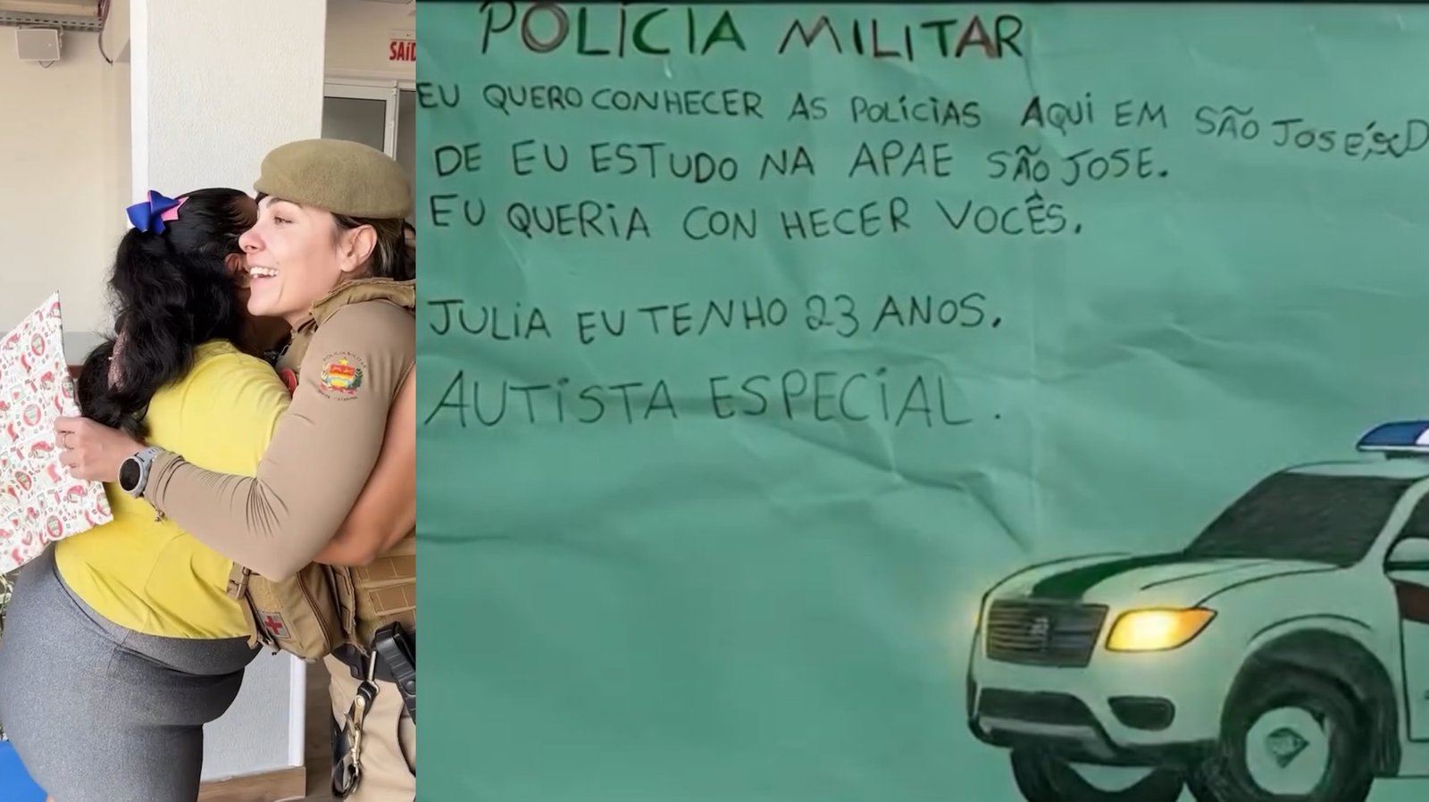 Nesta sexta-feira (7), policiais militares de São José, na Grande Florianópolis, realizaram o sonho de Júlia, uma jovem de 23 anos, autista e aluna da Associação de Pais e Amigos dos Excepcionais (APAE), que desejava conhecer de perto os policiais da cidade.