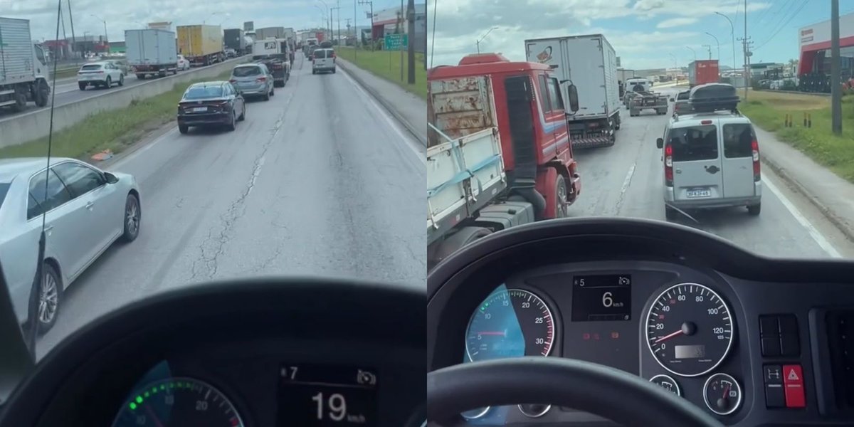 Um motorista de container decidiu gravar um vídeo enquanto fazia exatamente aquilo que ele mesmo critica: furar a fila no trânsito de Itajaí usando a faixa da direita para cortar na frente dos demais motoristas. O detalhe é que ele narra tudo com ironia, como se estivesse denunciando os outros.